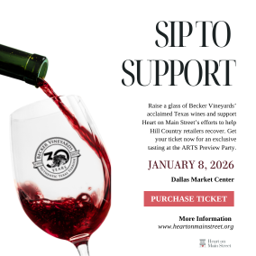 Experience Texas wines at the ARTS Preview Party while supporting Heart on Main Street’s work to help Hill Country retailers recover. Purchase this exclusive tasting to elevate your evening.