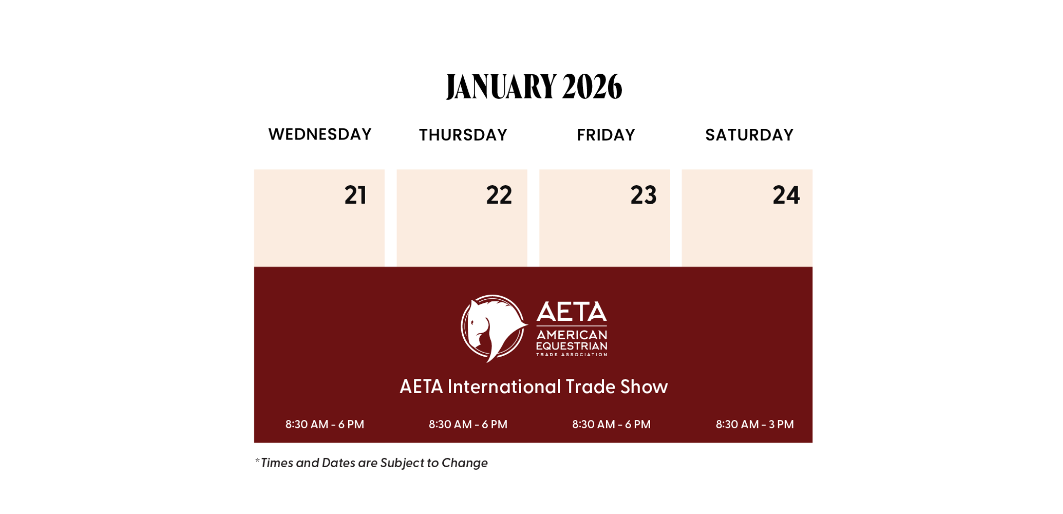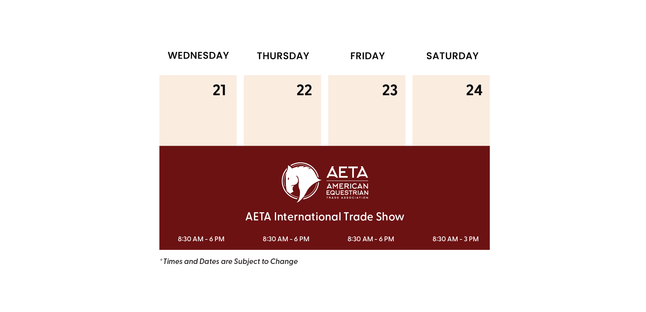 The American Equestrian Trade Association (AETA) show is the premier global trade event showcasing the top brands in English riding supplies and lifestyle including apparel, accessories, and equipment as well as lifestyle resources such as gifts and home décor. Pre-register today to attend experience the newest in English.