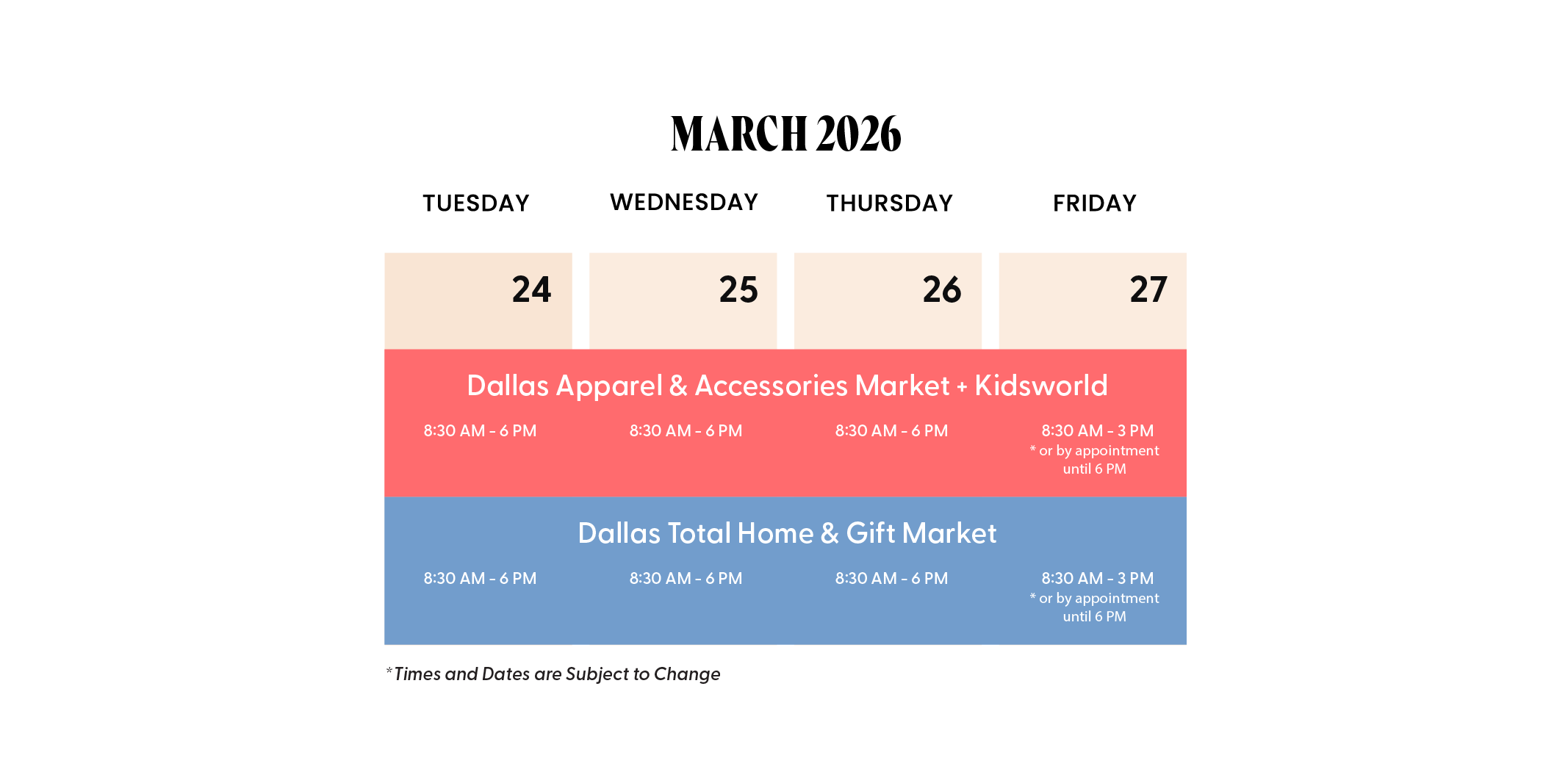 This blockbuster event features two markets in one. Find the latest styles in apparel and accessories, plus best-selling and one-of-a-kind gifts, gourmet and housewares items and home resources. Discover it all. Only in Dallas.